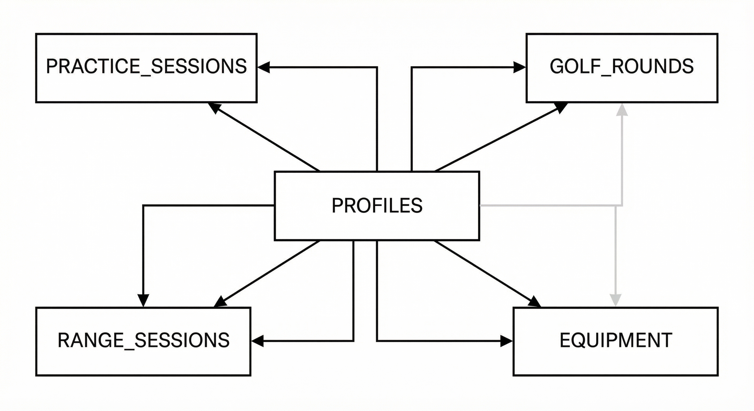 Golf data had to support round, hole, shot, and session levels. I designed a schema where practice_sessions (putting, chipping, pitching) and range_sessions share a consistent structure, with RLS enforcing user isolation. Handicap and analytics are derived from these sources rather than stored separately, keeping the model coherent and avoiding drift.